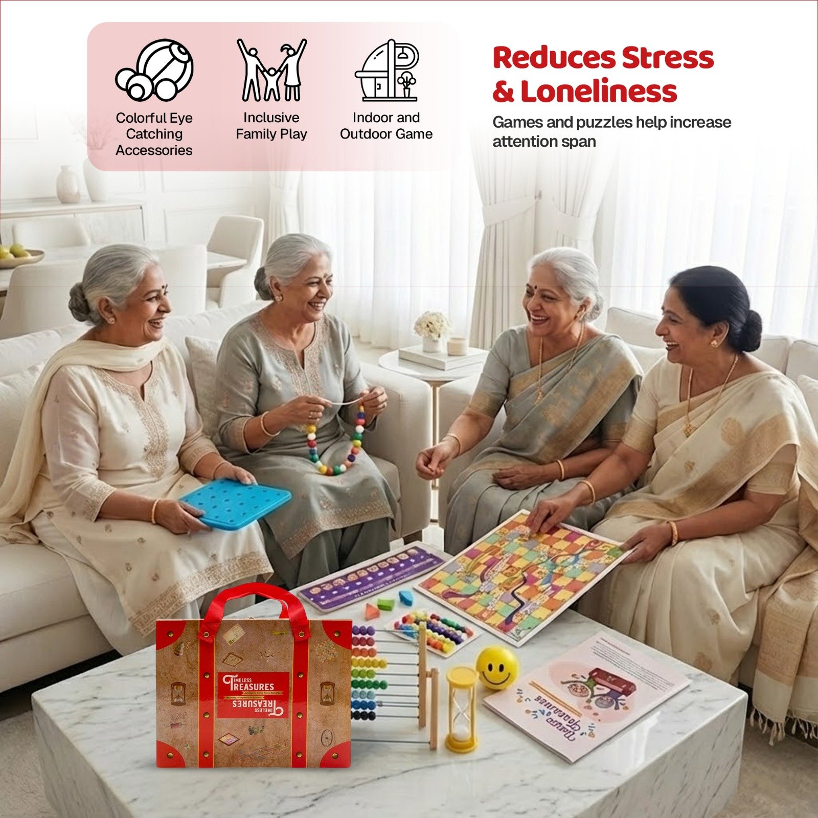 Ideal for homes, senior care centers, and therapeutic environments, Timeless Treasures gently brings purpose, positivity, and joy into everyday life — helping elders feel connected, valued, and truly engaged.